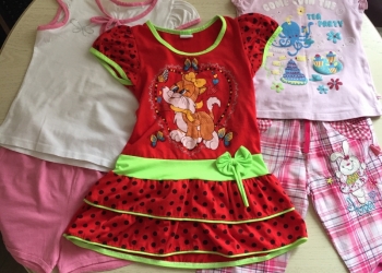 Пакетом вещи на девочку 4-6лет, зависит от комплекции ребенка. Платья красивые, яркие, стопроцентный хлопок.